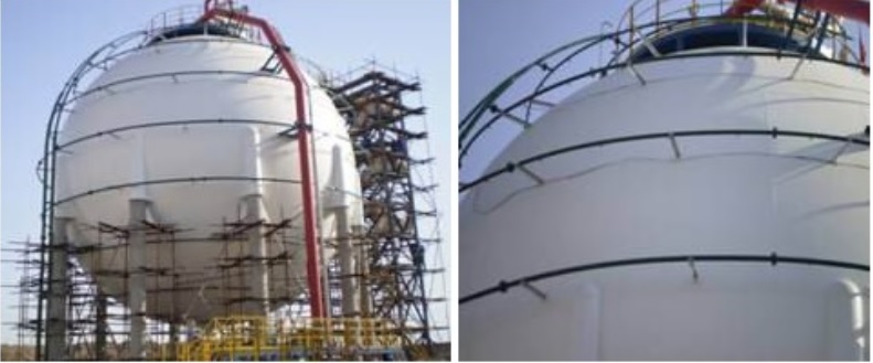 储气罐的形状与储油罐不一样,储气罐主要是球状,因此如何布设温度探测器与有关不太一样,通常根据球体的直径大小布置若干圈探测器,每圈温度探测器布设的位置主要看关键探测点布设,也可以平均间隔布设。