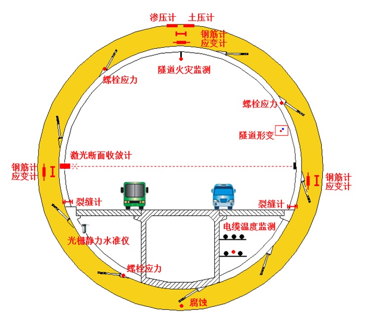 为了交通的便捷和快捷,提高运输效率和效益,在公路、铁路、城市交通的建设中出现了大量的隧道建设,由于隧道大多建设在城市地下、山区、江河湖泊底部,地质状况复杂,任何地质情况的变化都会给遂道的安全带来极大的危险,因此,无论是在隧道建设的过程中还是隧道运行使用的过程中均应实施状态健康监测。