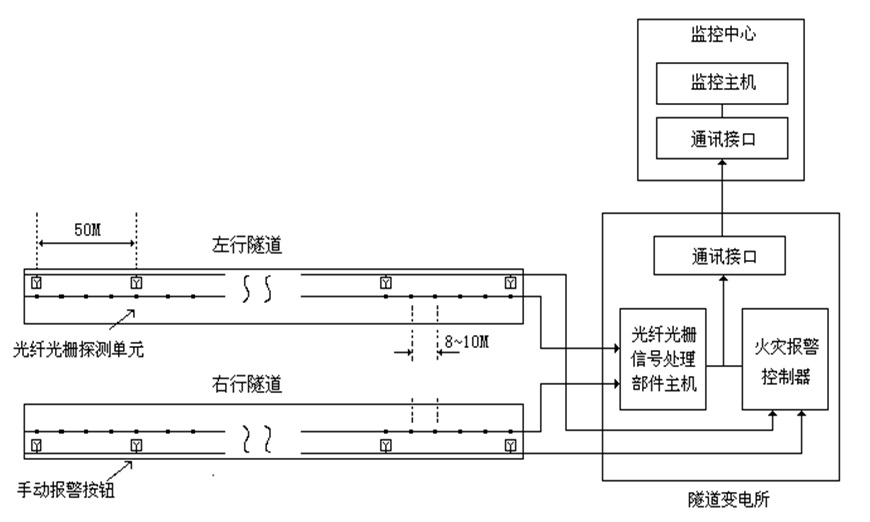 根据交通隧道的构造,通常将温度传感器布置在隧道的顶部,传感器以串联的方式串接在每个光传输通道的传输光纤上。每个光传输通道可串联20-30个左右被赋予不同波长值的温度传感器,根据隧道空间的大小,传感器间隔按8-10米考虑,既可单排敷设也可双排敷设,可实现单套设备对长距离和超长距离隧道的火灾探测,既节省空间又节省投资。