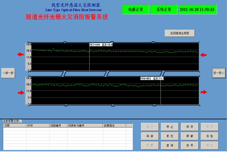 8、用户软件界面可以直观地了解隧道的安全情况,并进行数据管理:温度列表、温度曲线、报警记录、历史记录;
