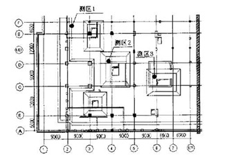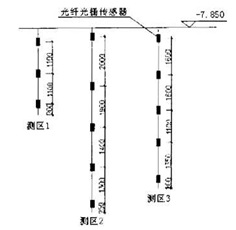 该基础厚度分别有2.5m、6m、7m,釆用光纤光栅传感器进行测温。光纤光栅传感器釆用金属套筒保护,使传感器在感受温度变化的同时可以自由伸缩不变形。同时由于我们测量的温度并非是瞬时的,而是一个稳定的温度,所以可以认为有足够的时间与套筒里的空气进行热交换,从而可以确保光纤光栅传感器测量的温度就是实际混凝土的温度。在基础混凝土浇注前,先 将光纤光栅温度传感器埋设在测点处,并与解调器相接,通过计算机釆集波长信号,并转换为温度值,监测系统构成如图1 所示。由于在电梯井处厚度比较大,水化热就比较大,温差更大,因此这两处应被列为重点测温区。分别在三个测区共布置13个光纤光栅传感器,其中测区1(2.5m板厚)有3个传感器,测区2(7m板厚)和测区3(6m板厚)分别有5个传感器。传感器布置示意图如下图2、3所示(图中涂黑圆圈代表测区)温度传感器在安装前,在试验室对其进行标定,可直接测定混凝土中的温度值。测温结果表明,上述测温点的布置方法具有较好的代表性。