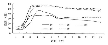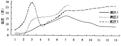 本工程基础混凝土自2004年1月5日下午开始浇筑到1月7日早晨浇筑完毕,我们实时的对各个测区的传感器位置的混凝土温度进行了共12天的监测。每天记录一份监测数据报告(前日12点至当日10点,每2小时记录数据一次各传感器的温度,每6个小时测量一次气温)。最后汇总出三个测区各个传感器在12天内的温度变化曲线,并绘出各个测区的最大温差曲线,见图4、图5、图6、图7。