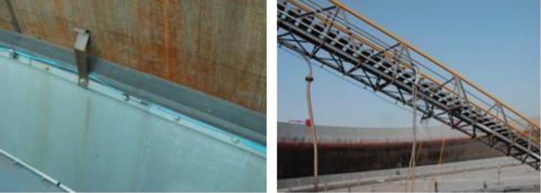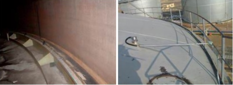外浮顶油罐主要是以储存原油为主,体积较大,必须设置火灾报警系统。在外浮顶储罐上,一般采用专用夹具将光纤光栅感温火灾探测器布设在浮盘/浮船密封圈附近。光纤光栅探测器使用传输光缆连接,在储罐内,传输光缆沿滑梯敷设,并垂落至浮盘处与光纤光栅探测器连接。其中滑梯至罐底浮盘处的传输光缆采用防爆挠线管敷设。