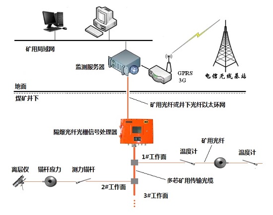矿用光纤光栅顶板应力监测系统是用于煤矿顶板状态在线监测系统。系统将光纤传感、计算机检测、数据通讯和传感技术融为一体。实现了复杂环境条件下对煤矿顶板状态的自动监测和汇报。